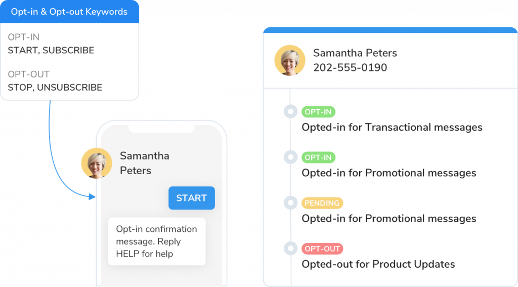 Maintain audit trail as per TCPA, GDPR, CCPA, CASL guidelines. Quick Wizard to configure Opt-In, Opt-Out Keywords to Get, Revoke and Renew Consent